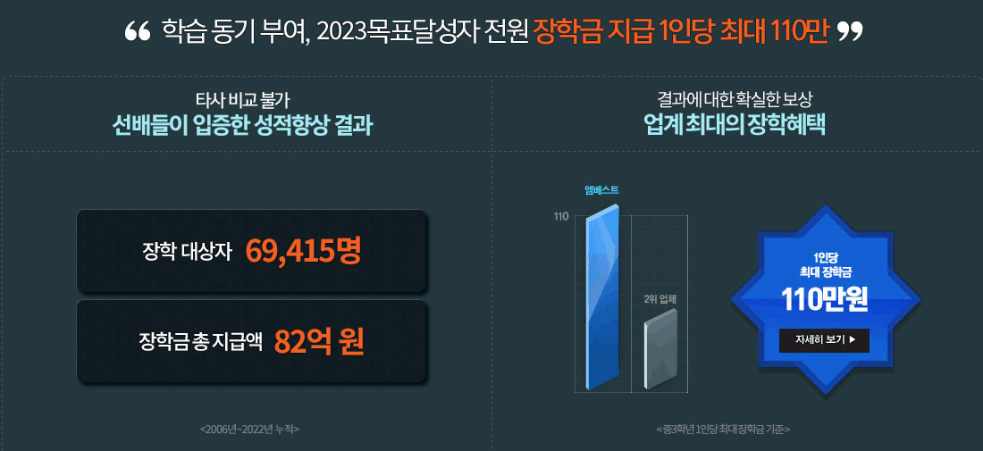 또 학생들의 학습 동기 부여를 위한 장학금 지급 이벤트도 진행합니다. 1인당 최대 110만원의 혜택을 얻을 수 있다고 홍보합니다.