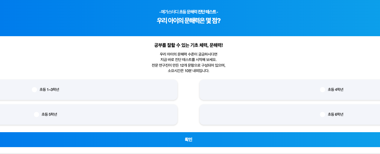 사이트에 접속하면 학년별로 크게 네 그룹으로 구분되어 있습니다. (초1~3, 4학년, 5학년, 6학년) 해당 학년을 선택하고 확인을 누르면 어떤 경로로 이 사이트를 알게 되었는지 확인하는 질문이 하나 나옵니다. 이 질문에 답을 하면 바로 테스트 시작할 수 있습니다.