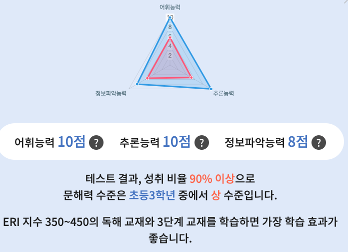 테스트를 마무리하면 EBS에서 특허 받은 문해력 수준 지표인 ERI(Ebs Reading Index)지수도 알려 줍니다. 이를 바탕으로 자녀에게 적합한 수업과 교재 커리큘럼도 추천해 줍니다. 또 총 3회로 구성된 봉투형 시험지를 구매하시면 더 자세하고 정확한 문해력 수준을 확인할 수도 있습니다.