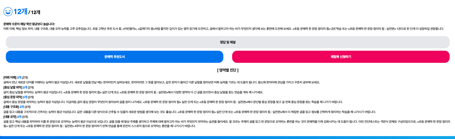 문제를 다 풀고 나면 바로 결과를 확인할 수 있고요 문해력 공부에 도움이 되는 도서(메가북스 교재)도 추천해 줍니다.