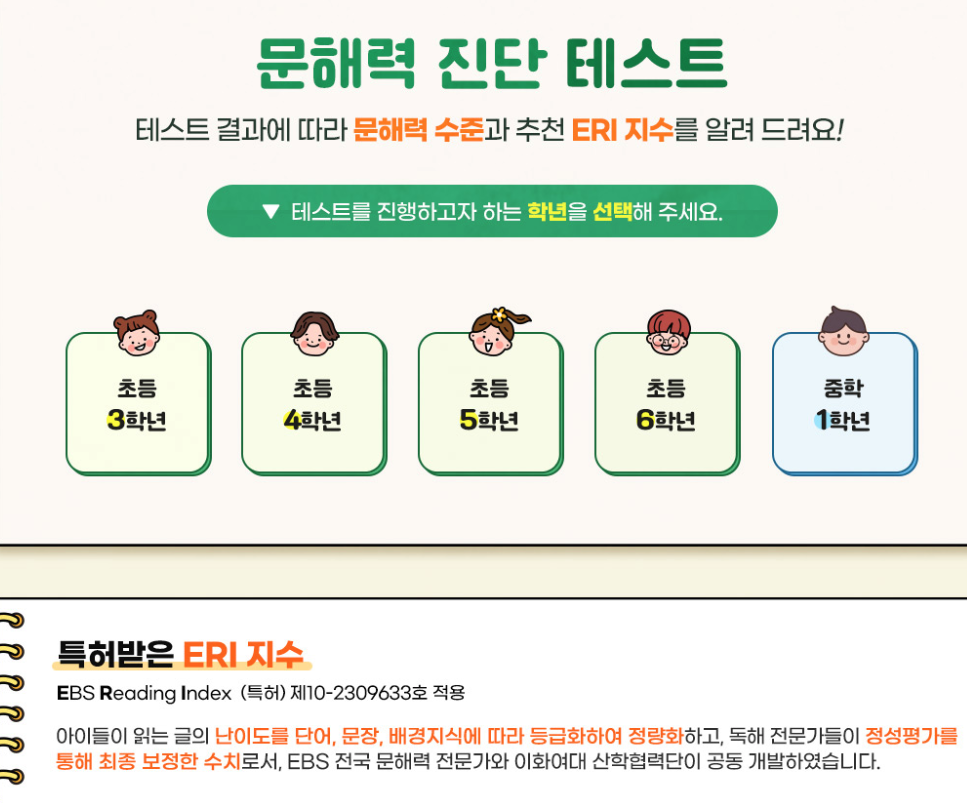 테스트를 마무리하면 EBS에서 특허 받은 문해력 수준 지표인 ERI(Ebs Reading Index)지수도 알려 줍니다. 이를 바탕으로 자녀에게 적합한 수업과 교재 커리큘럼도 추천해 줍니다. 또 총 3회로 구성된 봉투형 시험지를 구매하시면 더 자세하고 정확한 문해력 수준을 확인할 수도 있습니다.