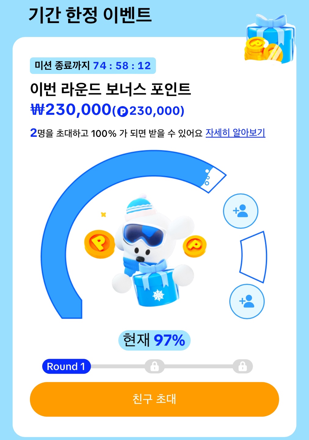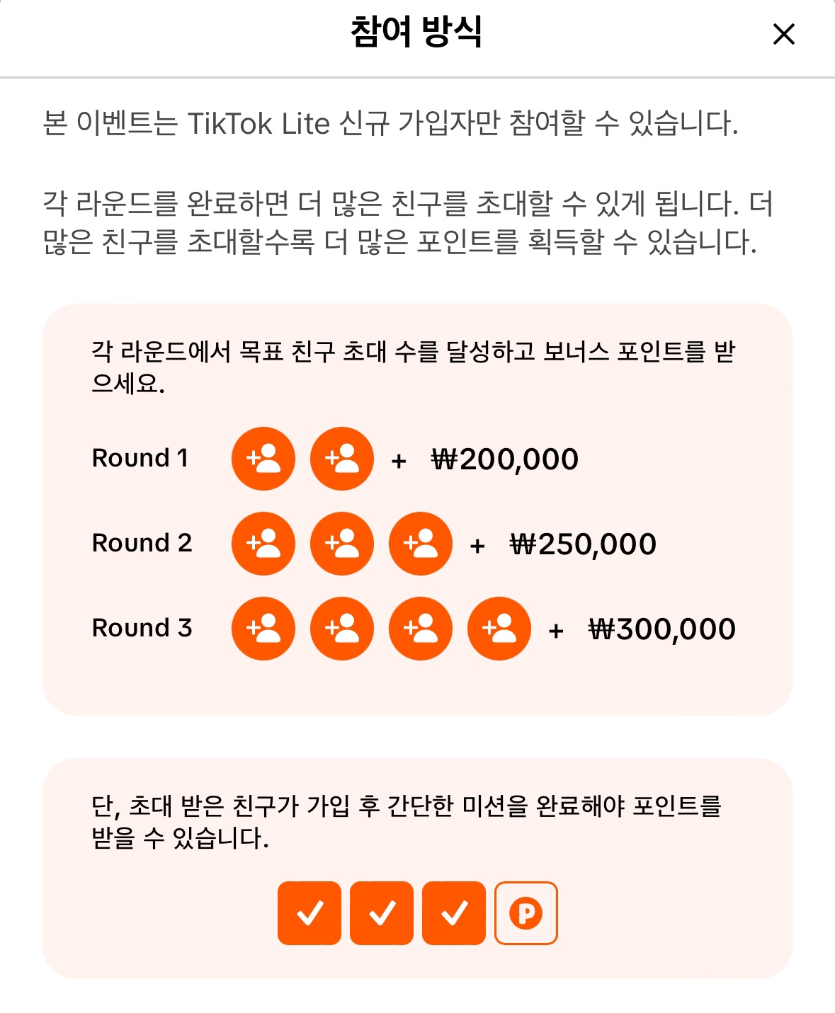 틱톡에서는 기간 한정 이벤트에 참여해서 꽤 쏠쏠한 보너스 포인트를 노려볼 수도 있는데요 이번 라운드에서는 모든 미션을 기간 안에 완료하면 최대 300.000원을 받을 수 있습니다. 최초 2명 초대, 다음은 세 명, 마지막 3라운드는 네 명입니다. 앱테크에 대한 인식이 통하는 친구들과 함께 하면 서로 윈윈이 될 수 있겠습니다.(친구 초대 코드로 참여하기)