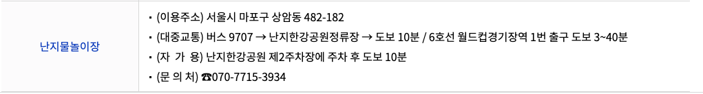 | 대중교통 | 버스 9707(난지한강공원정류장) 하차 후 도보 10분 6호선 월드컵경기장역 1번 출구 도보 3~40분 |
