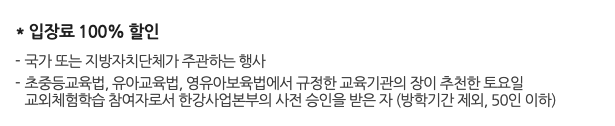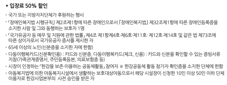 이마저도 장애인 및 국가 유공자, 65세 이상의 노인, 다둥이 가족, 한강 공동체 활동 참여자, 아동 복지 시설에서 생활하는 보호 대상 아동 등은 50% 할인 받을 수 있습니다.