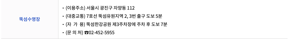 | 뚝섬 수영장 위치 | 서울시 광진구 자양동 112 |