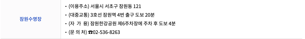 | 잠원 수영장 위치 | 서울시 서초구 잠원동 121 |