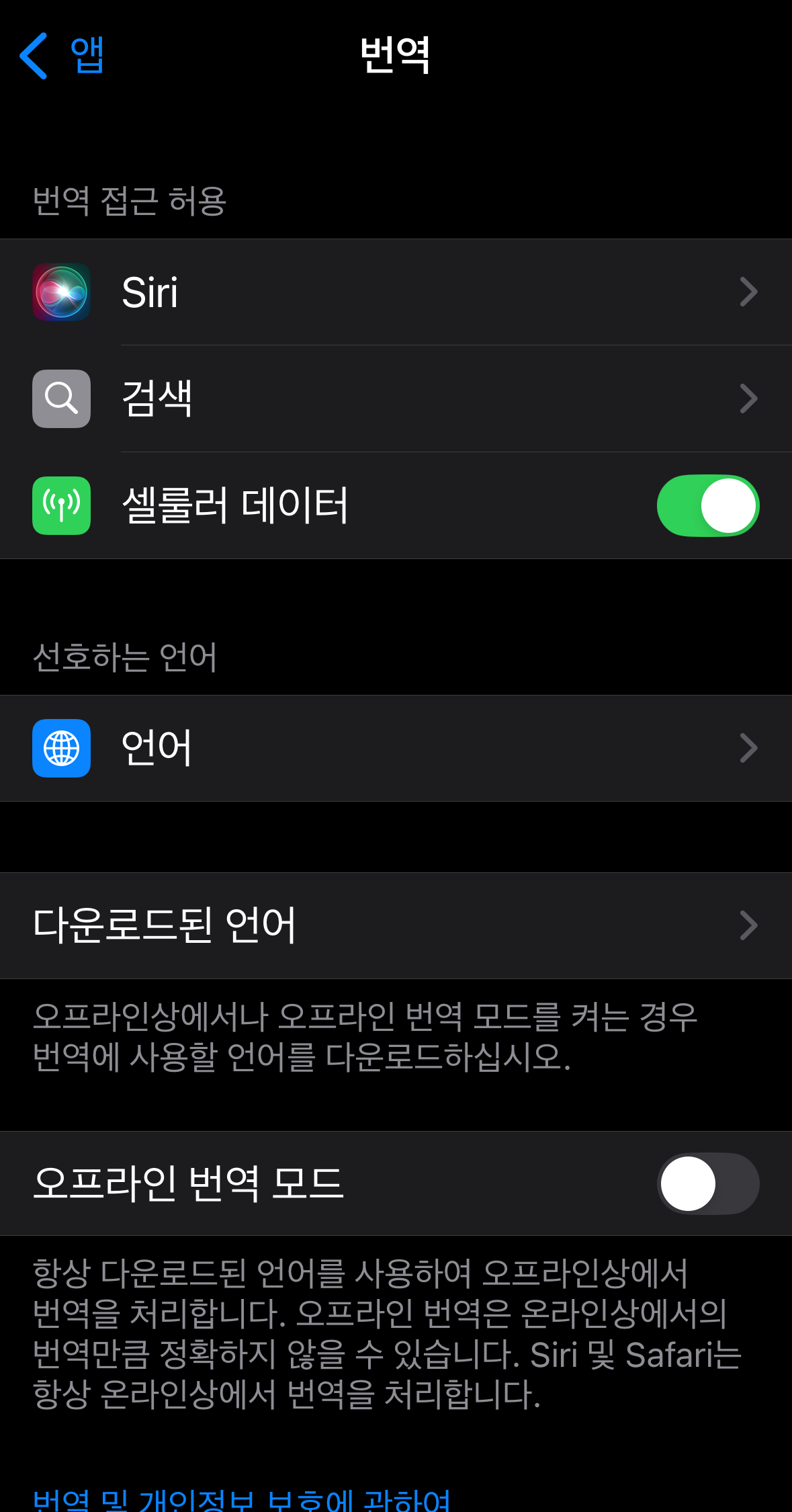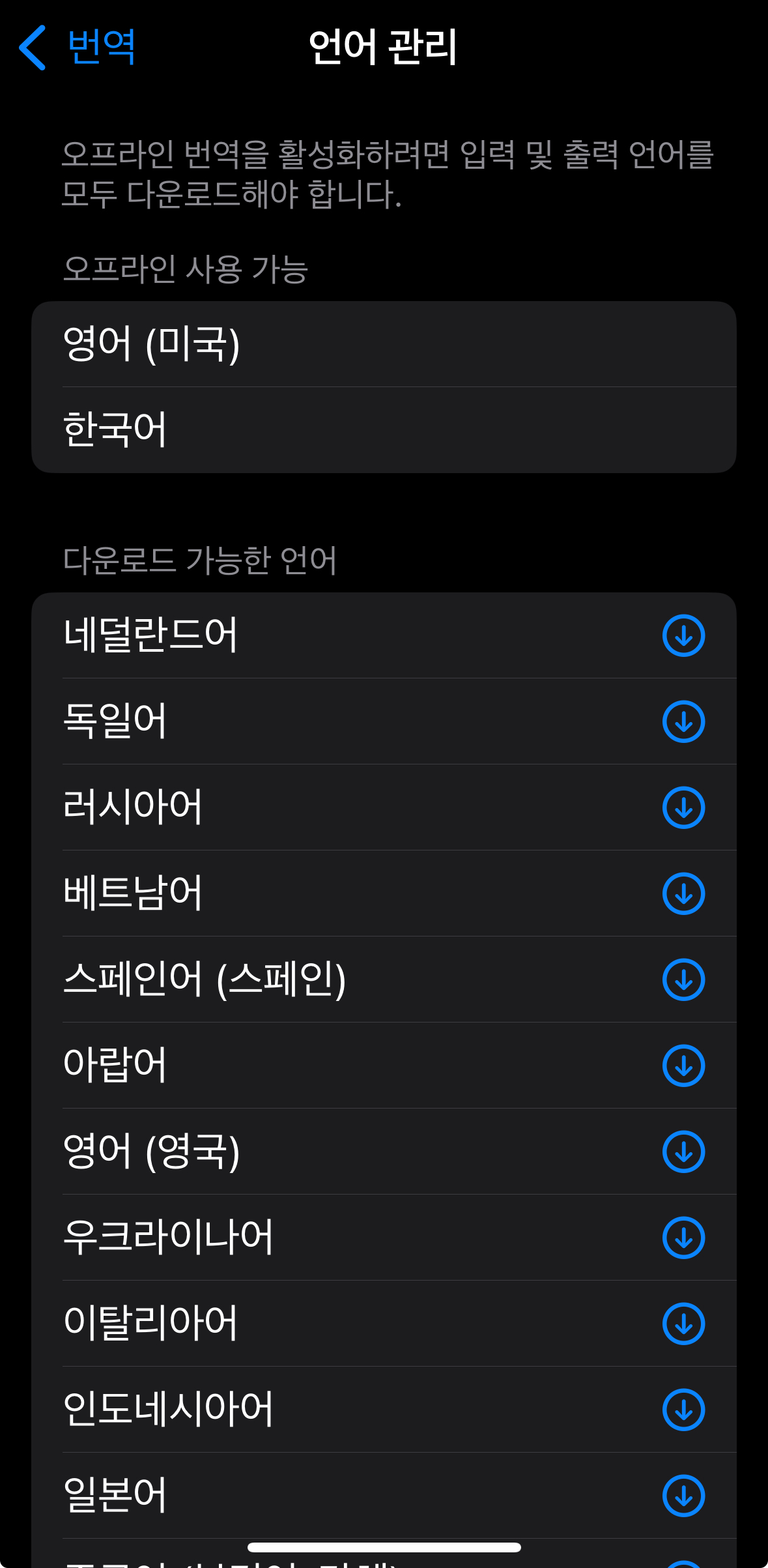 아이폰 번역 어플 실행 및 설정으로 들어가시면 다운로드된 언어 메뉴를 확인하실 수 있습니다.