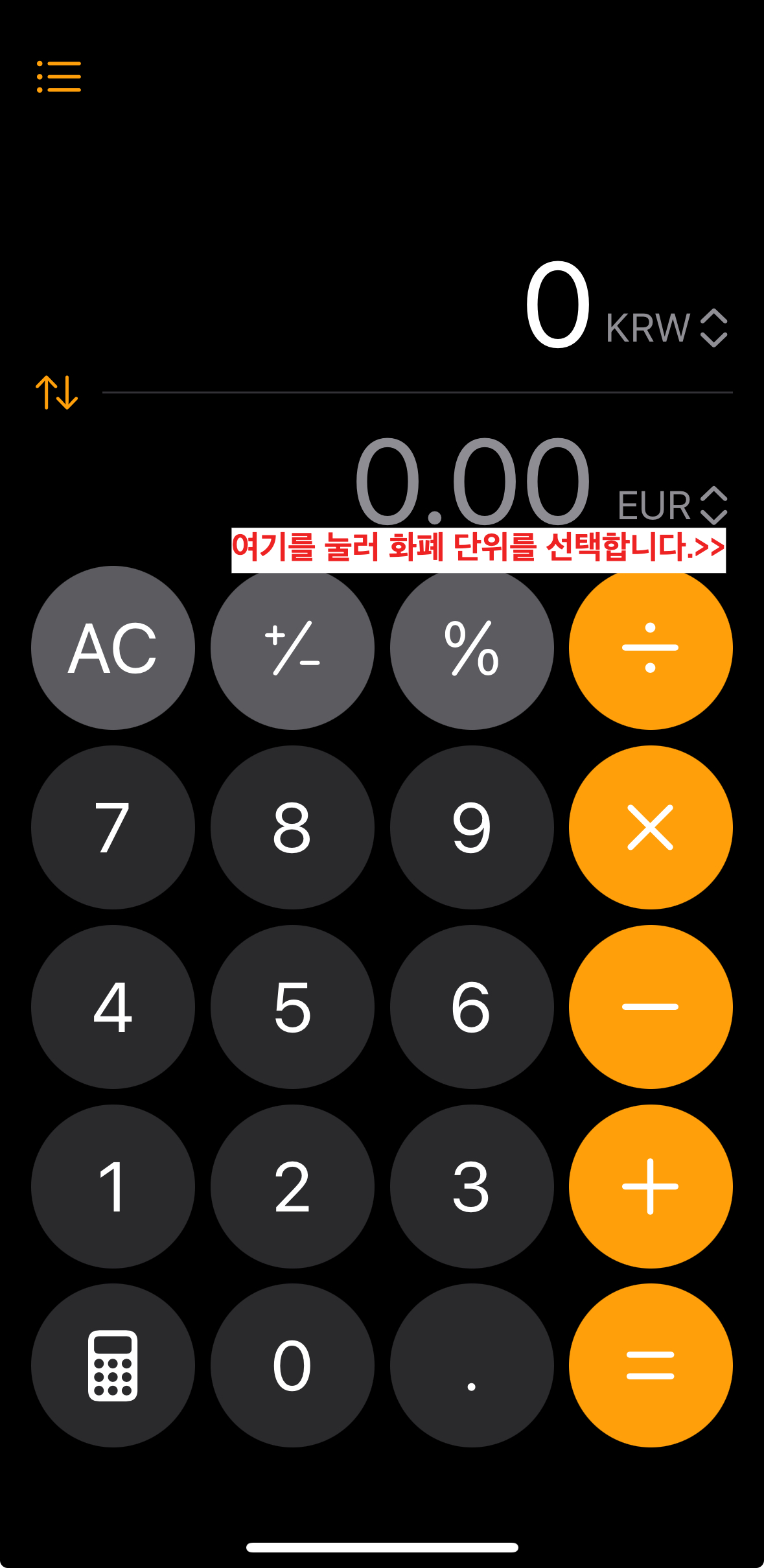 아래쪽 화폐 단위 화살표를 누르면 여행지 화폐 단위를 선택할 수 있습니다.