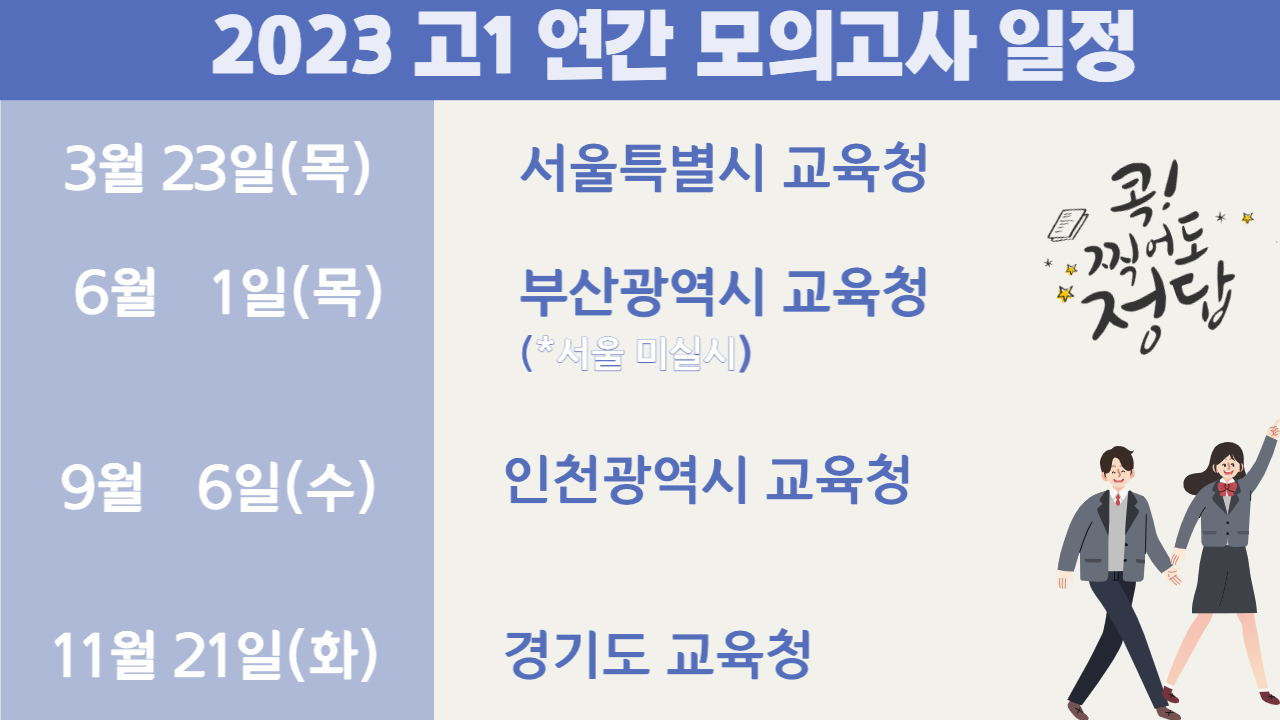 오늘은 3월 모의고사를 포함 고1 학생들의 2023년 연간 모의고사 일정을 살펴보고 3월 모의고사 범위도 알아 보겠습니다. 나아가 아직 모의고사 치를 준비가 덜 된 학생들을 위해 2022, 2021에 실시된 고1 3월 모의고사 국어 시험지도 공유하겠습니다.
