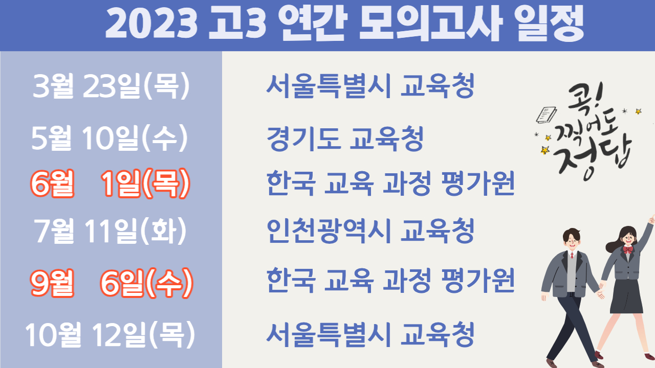 고3 학생들은 11월 수능을 보기 전에 3월 5월 6월 7월 9월 10월, 총 6차례 모의고사를 치룹니다. 이 중에 6월과 9월은 수능을 출제하는 한국 교육 과정 평가원에서 주관하는, 올해 수능 출제 경향을 짐작해 볼 수 있는 보다 중요한 시험이기도 합니다. 아래는 2023년 고3 연간 모의고사 일정정리한 것입니다.