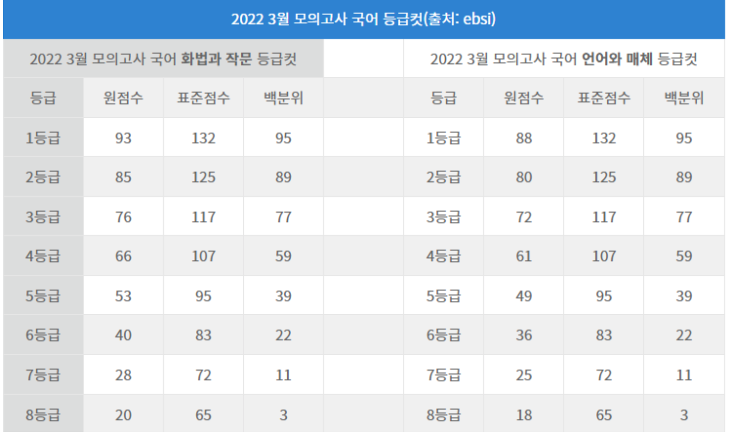 2022년 고3 3월 모의고사 등급컷은 다음과 같습니다. 기출 문제를 풀어 보고 나서 등급컷을 보면서 자신의 현재 위치를 확인해 볼 필요가 있습니다. 현재 위치에 대한 객관적 인식이 있어야 더 뚜렷하게 보완하고 발전할 수 있을 것입니다.