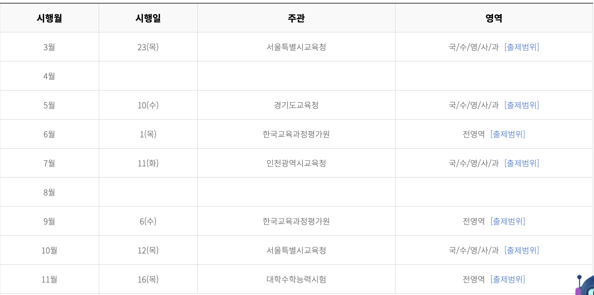 2023년 연간 모의고사 일정은 다음과 같습니다. 경기도 교육청 주관의 모의고사는 5월 10일(수)에 실시합니다. 학생들은 학교별 중간고사가 마무리된 후 모의고사를 보게 됩니다.