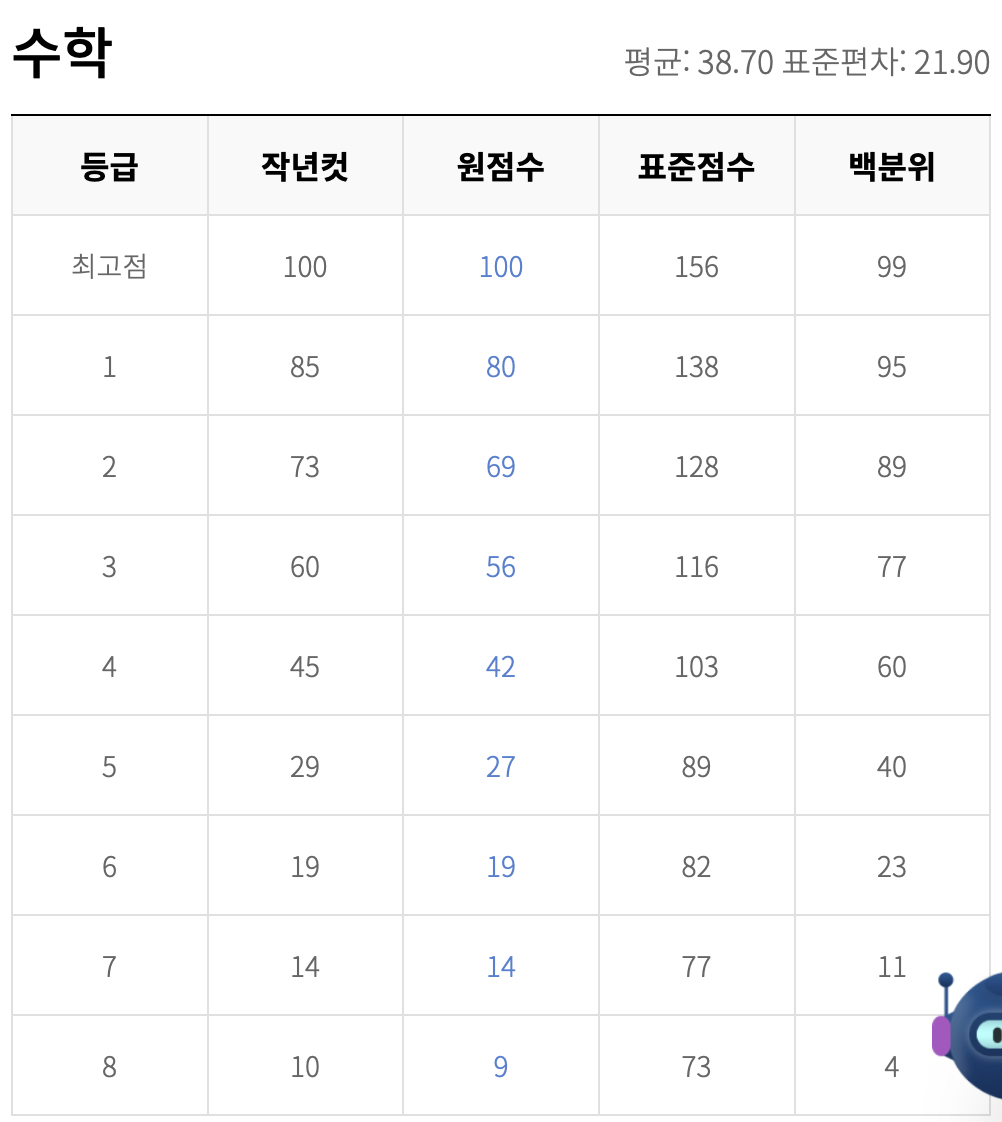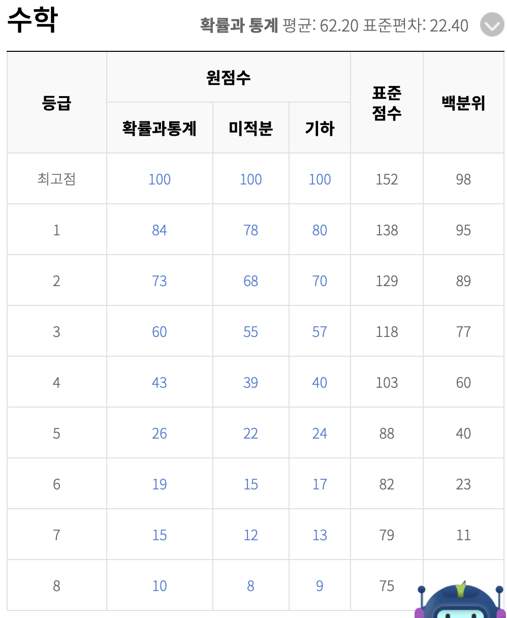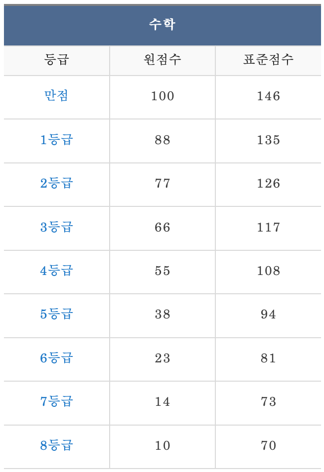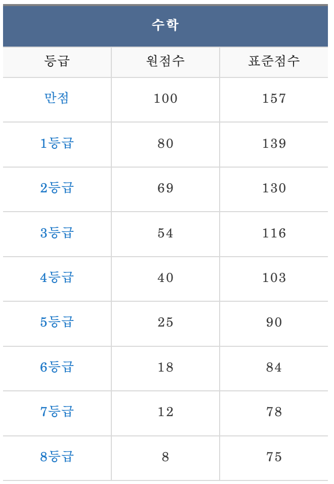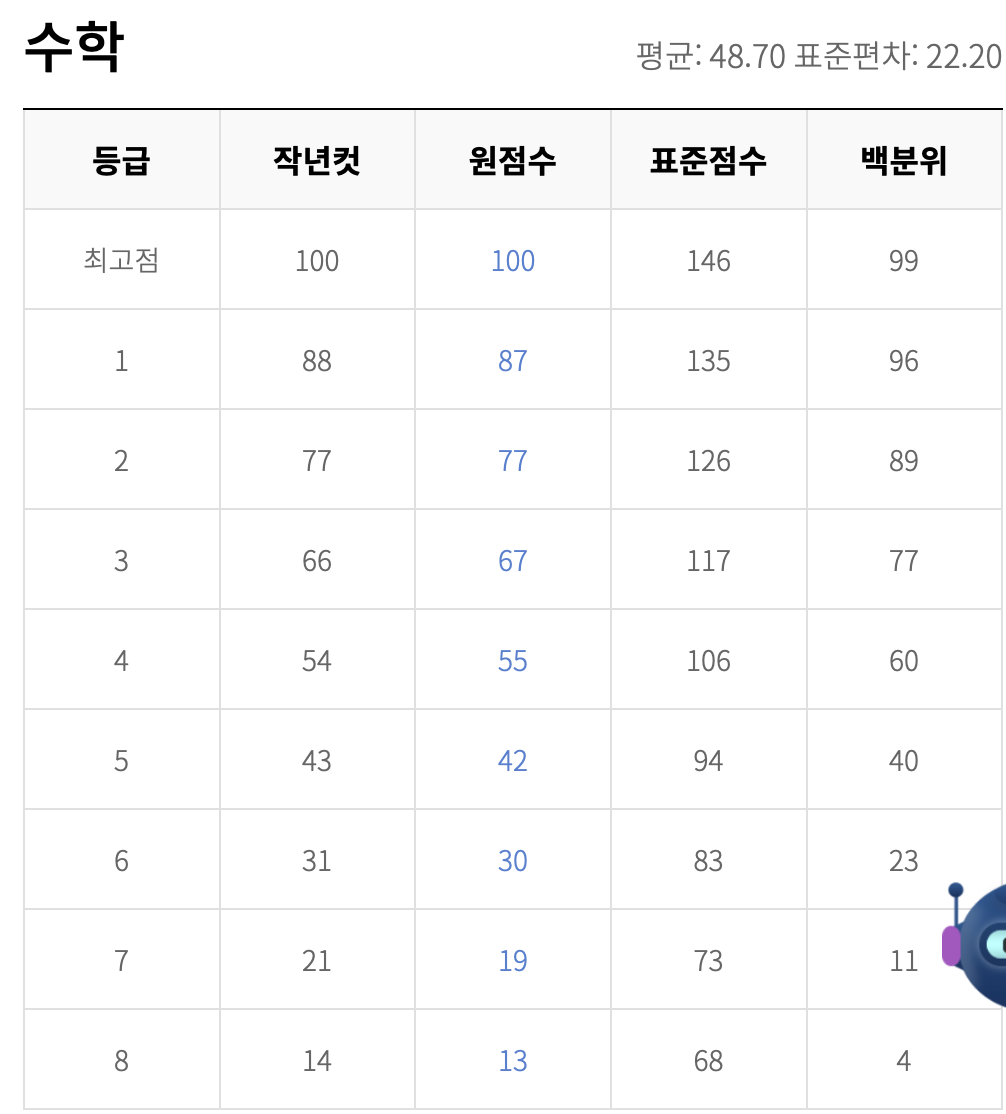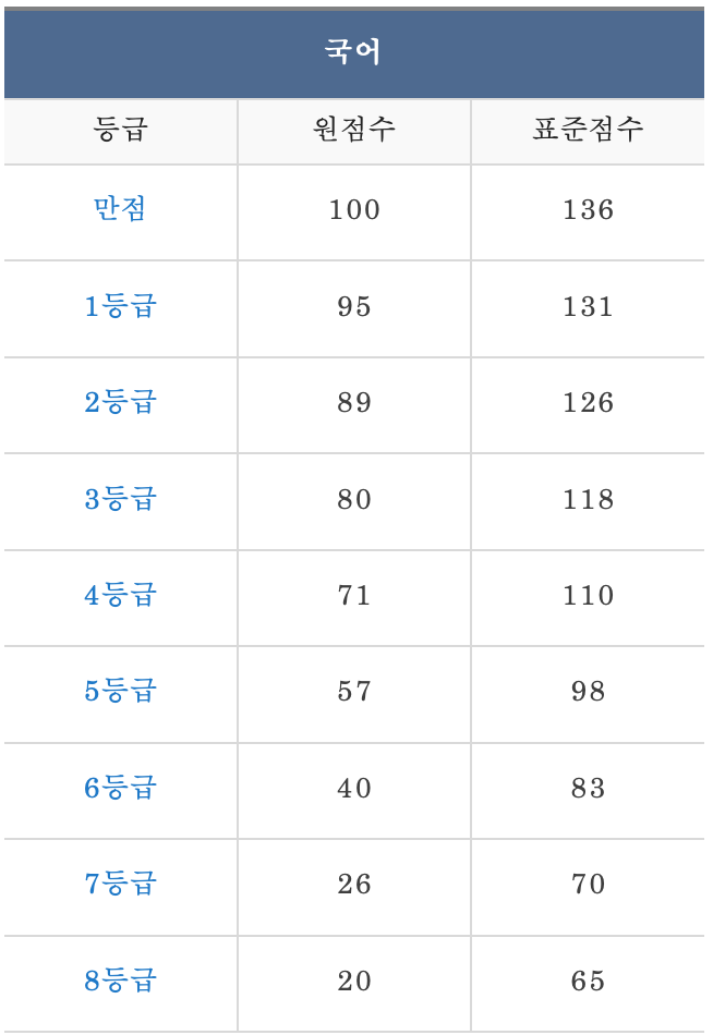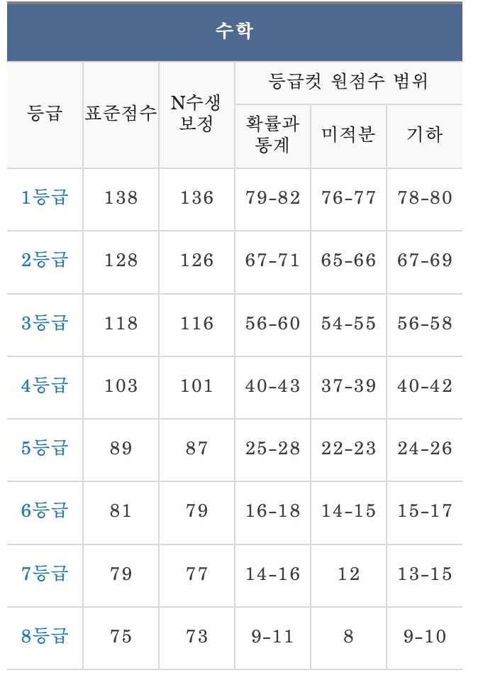 다음은 고2 수학 예상 등급컷입니다. 수학은 두 사이트의 예상 등급컷이 거의 같습니다. 표준 편차는 국어 보다 낮습니다. 새삼 국어의 난이도에 다시 한 번 놀라게 됩니다.