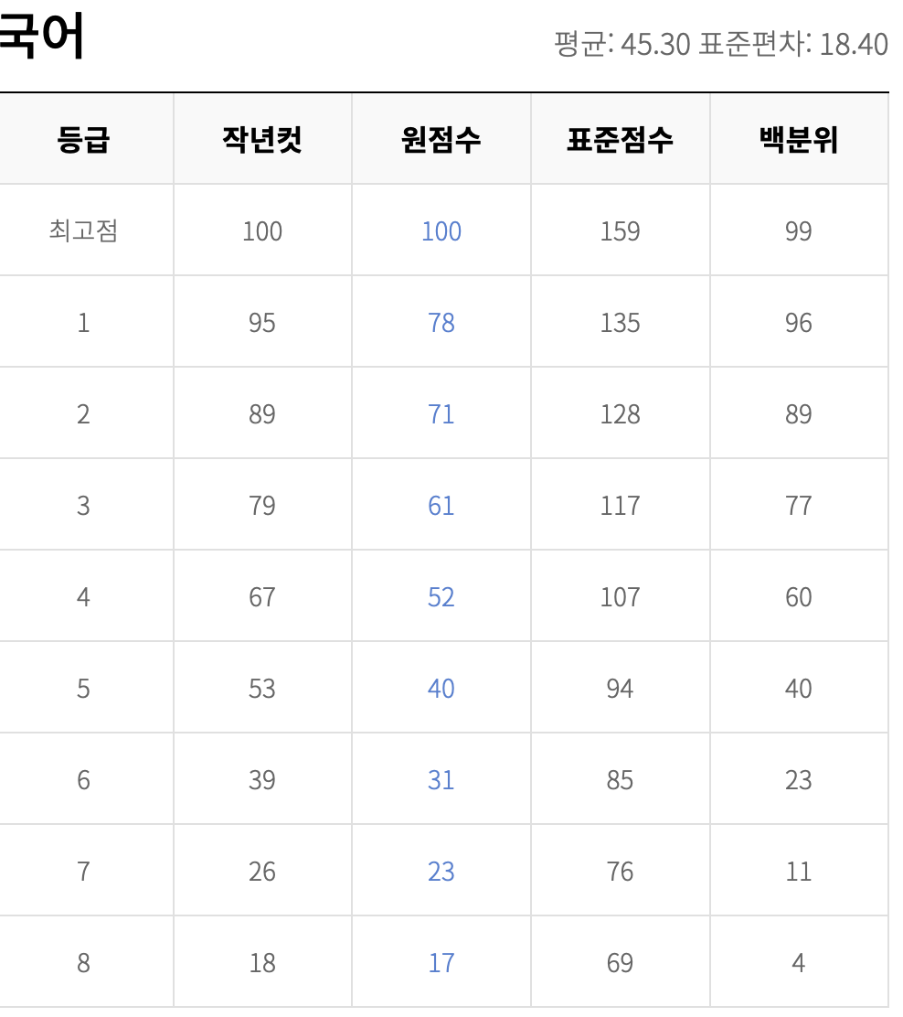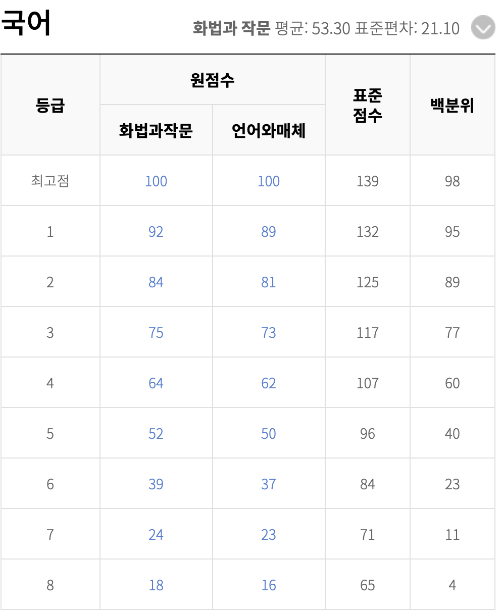다음은 고2 국어 예상 등급컷입니다. 작년과 비교하면 학생들에게 굉장히 어려웠던 시험임을 짐작할 수 있습니다. 표준점수를 보면 난이도를 체감할 수 있습니다. 대다수의 고2 학생들이 1교시에 많이 당황했을 듯합니다.