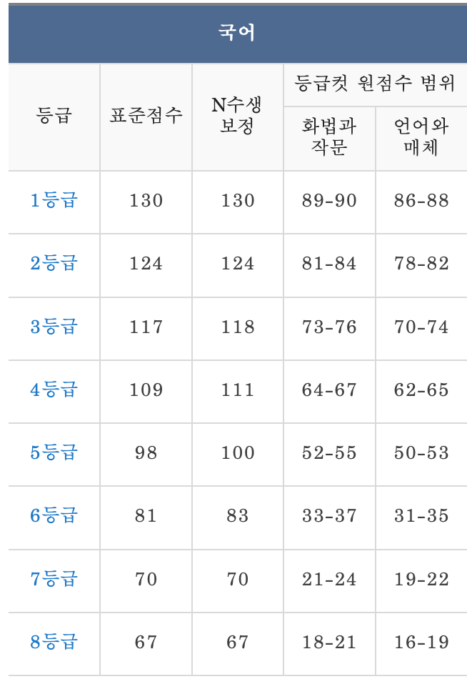 고3 국어 예상 등급컷입니다. 선택 과목에 따라 화법과 작문, 언어와 매체로 나뉩니다. 현재는 예상 등급컷이므로 확정은 다를 수 있습니다. 아래 그림 위가 'M'사의 집계이고 아래는 EBSi에서 확인한 것입니다.