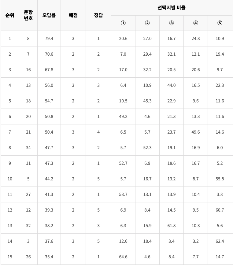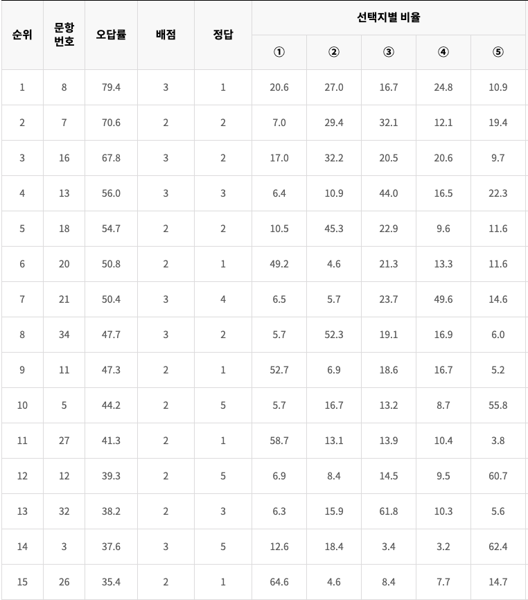 모의고사를 풀고 나서 오답 정리하면서 돌아보는 과정도 꽤 중요한데요 진짜 공부는 시험 이후에 시작된다고 해도 과언은 아닙니다. 이때 공부의 효율을 높이려면 같은 시험의 오답률 상위 문제를 확인하고 이 문항과 지문들을 중심으로 보는 것도 좋겠습니다.