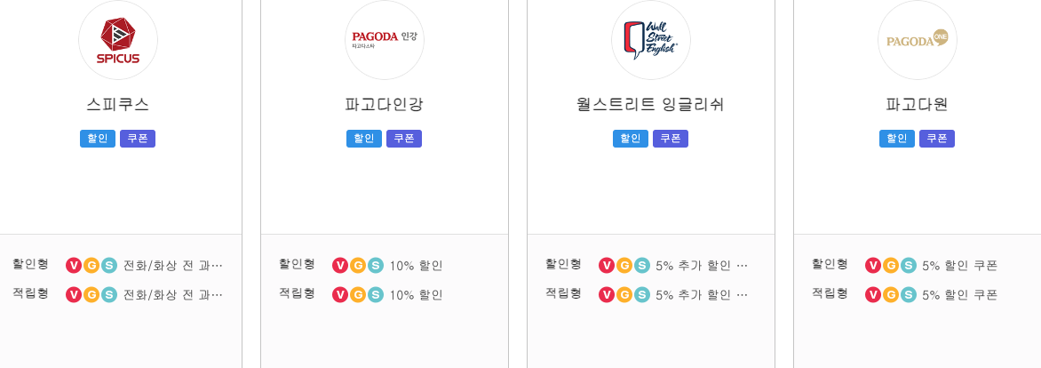 스피쿠스, 월스트리트, 잉글리시, 파고다 토쿨 등 주로 외국어를 공부하고자 할 때 혜택 받아보실 수 있겠습니다.