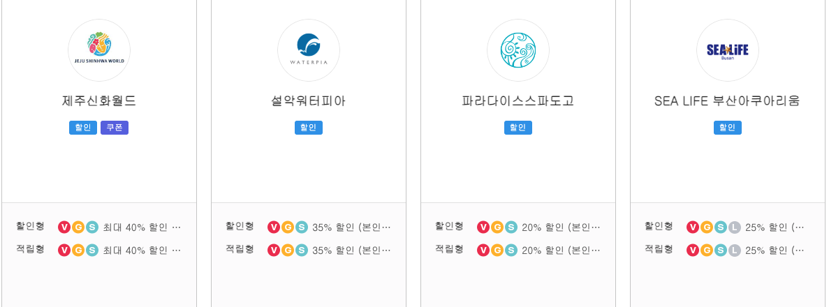 이밖에 서울랜드, 제주 신화 월드, 설악 워터피아, 아쿠아플라넷도 최소 10%에서 최대 40% 할인 적립 가능하나